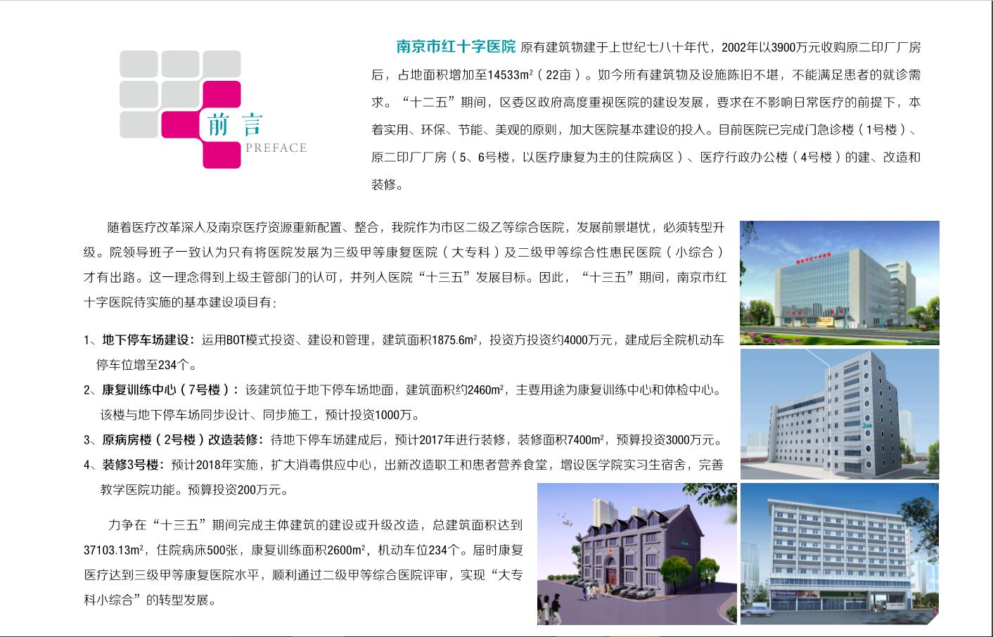 南京市红十字医院始建于1946年,前身是中国红十字会总会南京分会诊疗所,是当时南京唯一面向广大平民的免费医疗机构,年门诊量仅次于当时的中央医院。1958年由南京市政府正式命名为南京市红十字医院。2002年8月,被市政府确定为南京市惠民医院,同时也成为全国首家惠民医院。2011年12月,获批冠名南京瑞华慈善医院,实现了贫困人群的免费基本医疗。 医院占地面积15000平方米,业务用房面积32942平方米。实际开放床位480张,设有15个病区,30余个临床辅助科室。年门急诊量28.09万人次,收治住院病人1.49万人次。现有在职职工528人,其中高级职称48人,中级职称129人。妇产科、消化内科为南京市医学重点专科,呼吸内科、普外科、康复科等是秦淮区重点专科。医院拥有西门子16排螺旋CT、西门子750四维彩超、DR数字成像系统等进口先进设备。可开展人工关节置换、断指再植、腹腔镜微创手术、宫颈LEEP锥切、前列腺电气化切除气压弹道碎石肿瘤微(无)创治疗、血液透析治疗、白内障超声乳化及人工晶体植入等项目。 为改善医疗用房紧张的境况,提升医院整体医疗服务水平,医院新建的门诊楼于2012年初投入使用,康复综合楼于2015年11月投入使用,康复病区成立。新病区拥有51张床位,配有315平方米的康复大厅,康复科开展以运动疗法、作业疗法、言语训练、吞咽训练及各项理疗治疗为主要手段康复治疗。2015年9月妇产科正式与南医二附院妇产科合作,开展包括科室管理、业务培训、临床教研在内的全方位长期合作。妇科、产科医疗服务水平大幅提高。 今后两年医院将着手原病房楼改造装修和院内停车场建设。 “十三五”期间,医院将建设成一所服务理念先进、环境优雅舒适、生活设施配套齐全,医疗服务技术精湛,康复特色彰显的现代化综合医院。 地址:秦淮区白下路242号,电话:86641430。